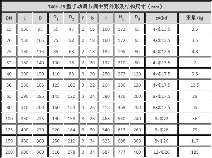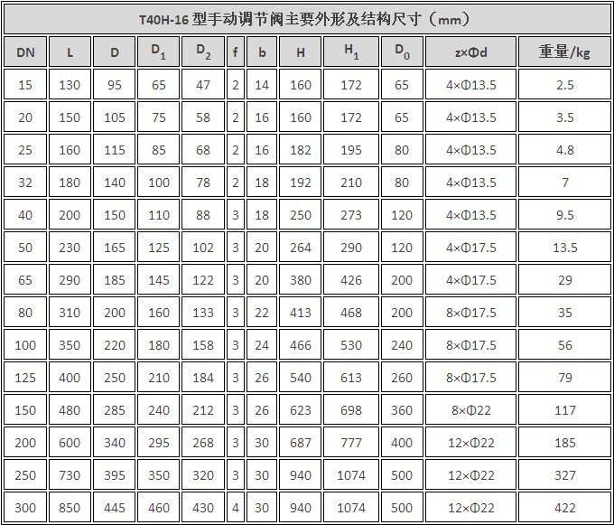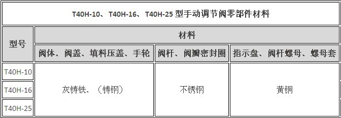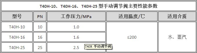 T40H型手动调节阀:适用于工作压力 ≤1.6MPa、介质温度 ≤200℃(和 ≤2.5MPa、介质温度 ≤350℃)的蒸汽或热水管路上作为调节流量之用。按顺时针旋转手轮即可关闭手动调节阀,这时阀杆带动阀瓣下降,直使两锥形密封面接触达到严密将管路关闭为止。