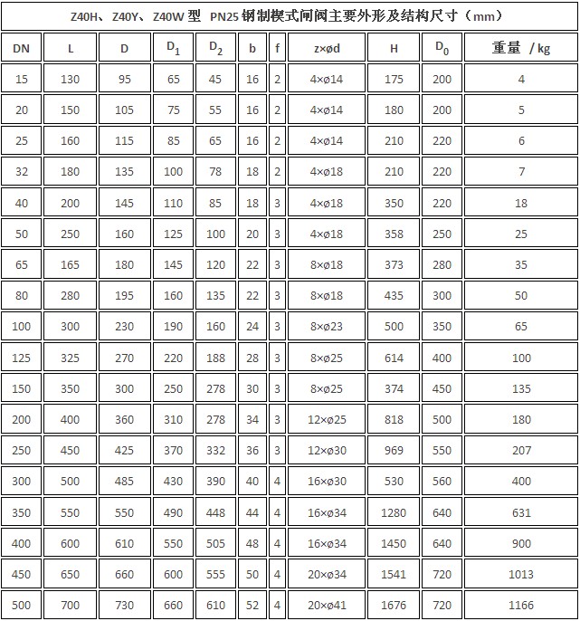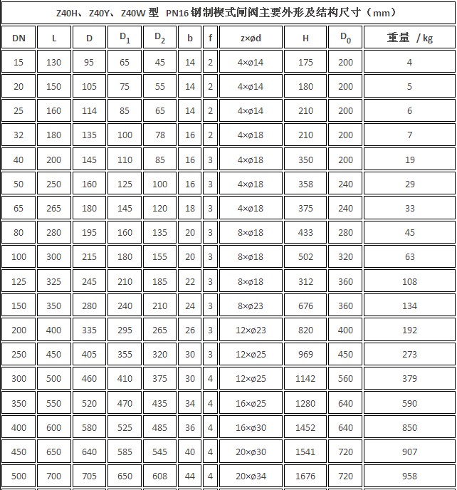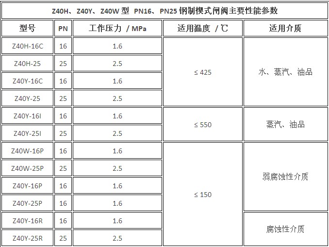 Z40H、Z40Y、Z40W 型钢制楔式闸阀:手动、法兰连接、明杆楔式弹性闸板,阀座密封面材料为不锈钢、硬质合金,工作压力 1.6-2.5MPa,阀体材料为碳素钢(Z40H-16C Z40H-25 Z40Y-16C Z40Y-25)、铬钼钢(Z40Y-16I/25I)、铬镍钛不锈钢(Z40W-16P/25P Z40Y-16P/25P)、铬镍钼钛不锈钢(Z40Y-16R/25R)的闸阀。